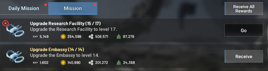![]() | Daily Missions 1. Daily mission list resets everyday. 2. Completing a mission will give you EXP and resources. 3. To proceed to the actual mission, tap 'Go' button. 4. If a mission is completed, a red dot marker will be visible on Daily Mission tab and 'Receive' button will be activated. 5. Once you've tapped 'Receive', this will directly update your current EXP and resources. 6. To receive all rewards at once, tap 'Receive All Rewards'. |